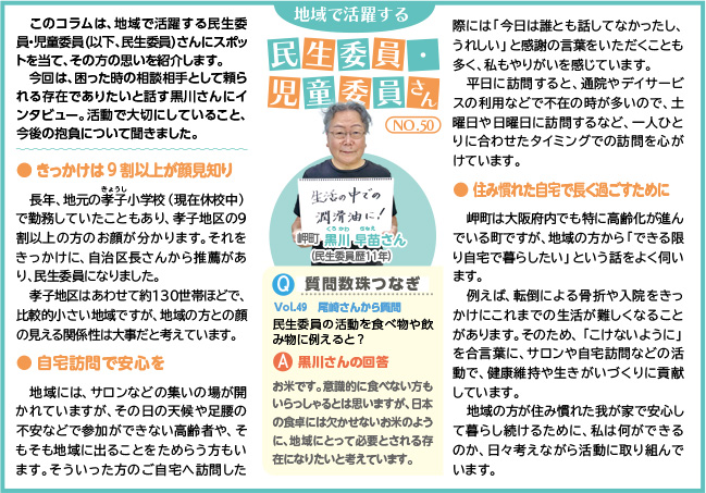 「場所」がつなぐ地域の架け橋 太子町 山田・畑地区福祉委員会 地域で活躍する民生委員・児童委員さんVol.50 岬町 黒川 早苗さん |