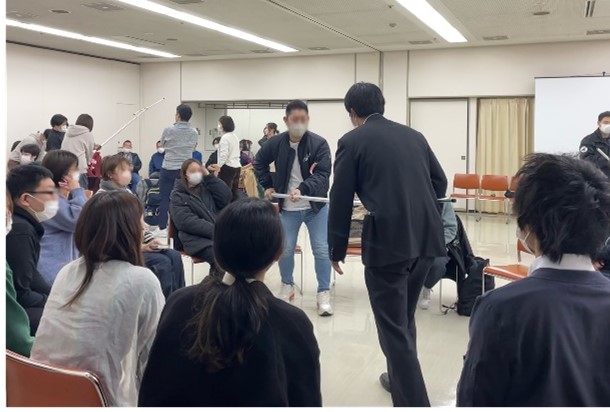 大阪府警察本部 生活安全部 府民安全対策課・大阪府 危機管理室 治安対策課の方々には、「安まちクロスロード」というカードゲーム形式での講義や、特殊詐欺について分かりやすく解説していただきました。浪速警察署の方々には、さすまたの効果的な使い方や不審者の対応方法について教えていただき、実際に受講者全員がさすまたを手に取って身を守る方法を考えました。
