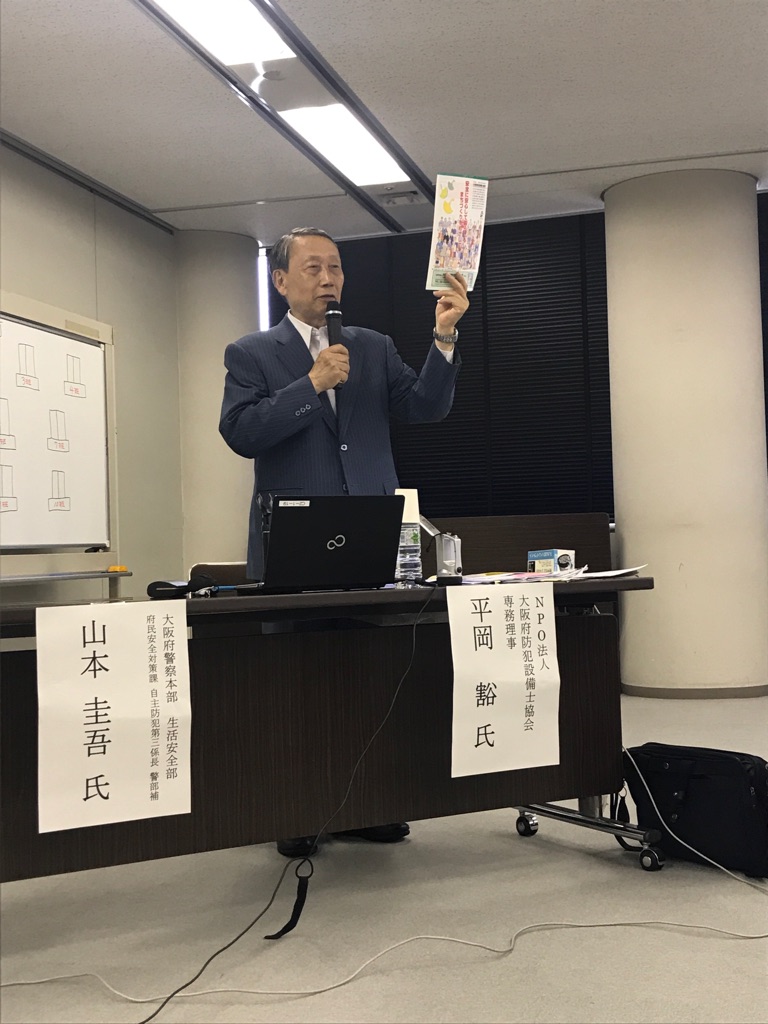 NPO法人大阪府防犯設備士協会、ならびに大阪府警察本部より講師をお招きし、プロの防犯知識を生かし、福祉施設にもできる防犯対策・技術をテーマに講演。