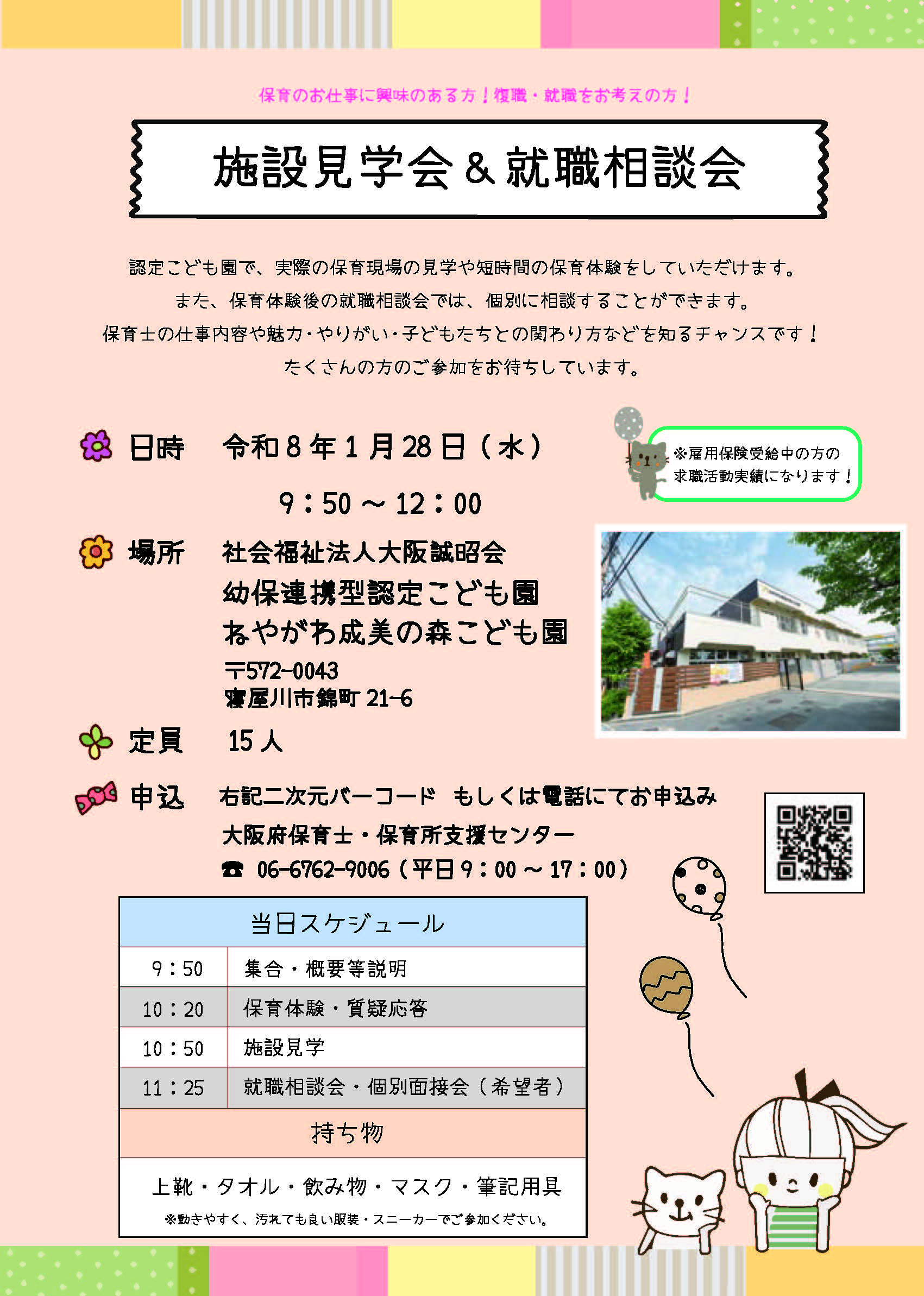 施設見学会&就職相談会 1/28(水)(ねやがわ成美の森こども園)