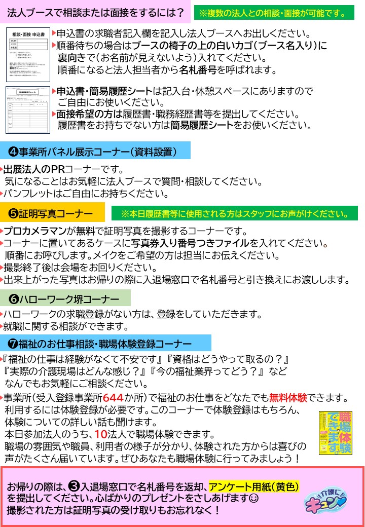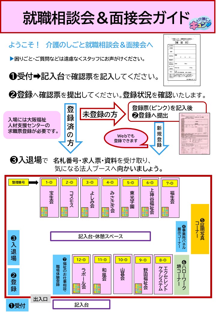 福祉のお仕事サイトの「仕事を探す」ページから新規登録し、求職票登録を行ってください。スムーズに入場できます。