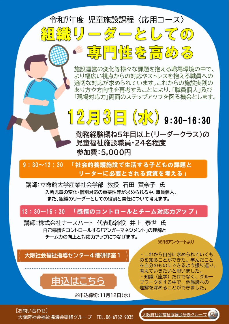募集中 児童施設課程(応用コース) 2025年12月3日【1日間】