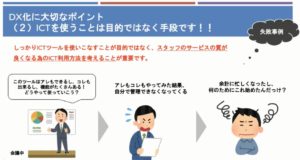 これから社会福祉業界がICTやDXの加速化において見失ってはいけない大切なポイントなど貴重な講演をいただき、参加者からは「DXの考え方を正しく認識できた。今日の体験談に基づく講義はこれからの日々の利用者支援に活かしていきたい」と感想が寄せられました。